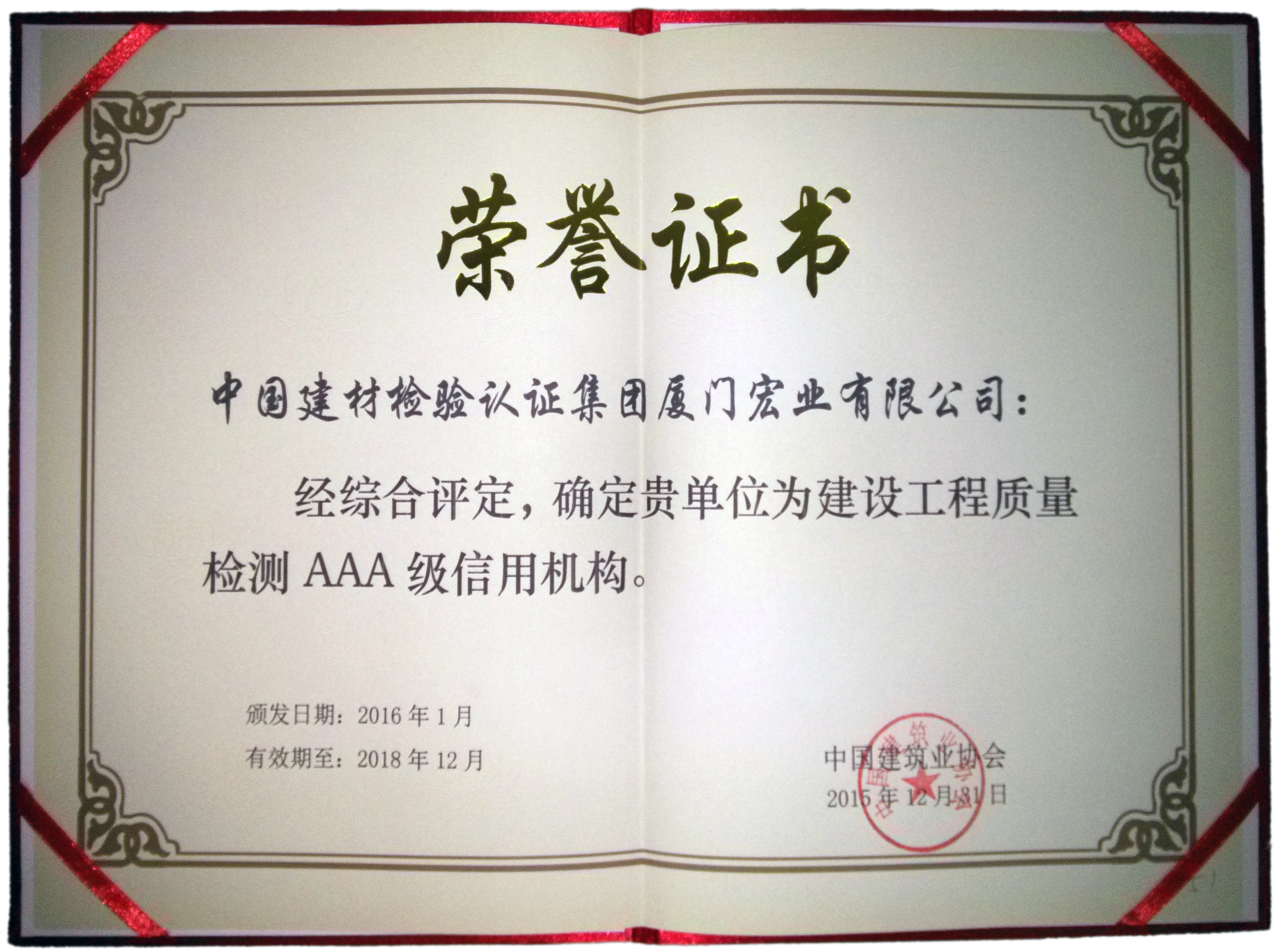 “建設(shè)工程質(zhì)量檢測(cè)AAA級(jí)信用機(jī)構(gòu)”是國(guó)內(nèi)對(duì)建設(shè)工程質(zhì)量檢測(cè)機(jī)構(gòu)信用等級(jí)的最高評(píng)價(jià),CTC廈門宏業(yè)繼榮獲福建省建設(shè)工程質(zhì)量檢測(cè)AAA級(jí)信用單位、廈門市工商信用優(yōu)異企業(yè)等名譽(yù)以來(lái),此榮譽(yù)可謂社會(huì)對(duì)我公司檢測(cè)工作規(guī)范性、真實(shí)性和準(zhǔn)確性的充分認(rèn)可。CTC廈門宏業(yè)將再接再厲,進(jìn)一步強(qiáng)化誠(chéng)信意識(shí),促進(jìn)行業(yè)自律,為工程建設(shè)行業(yè)的持續(xù)健康發(fā)展做出新的貢獻(xiàn)。